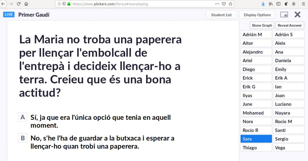A partir d’aquesta pregunta, vam aprendre a utilitzar una nova eina anomenada Plickers per analitzar com actuar en diverses situacions i ens va agradar moltíssim!