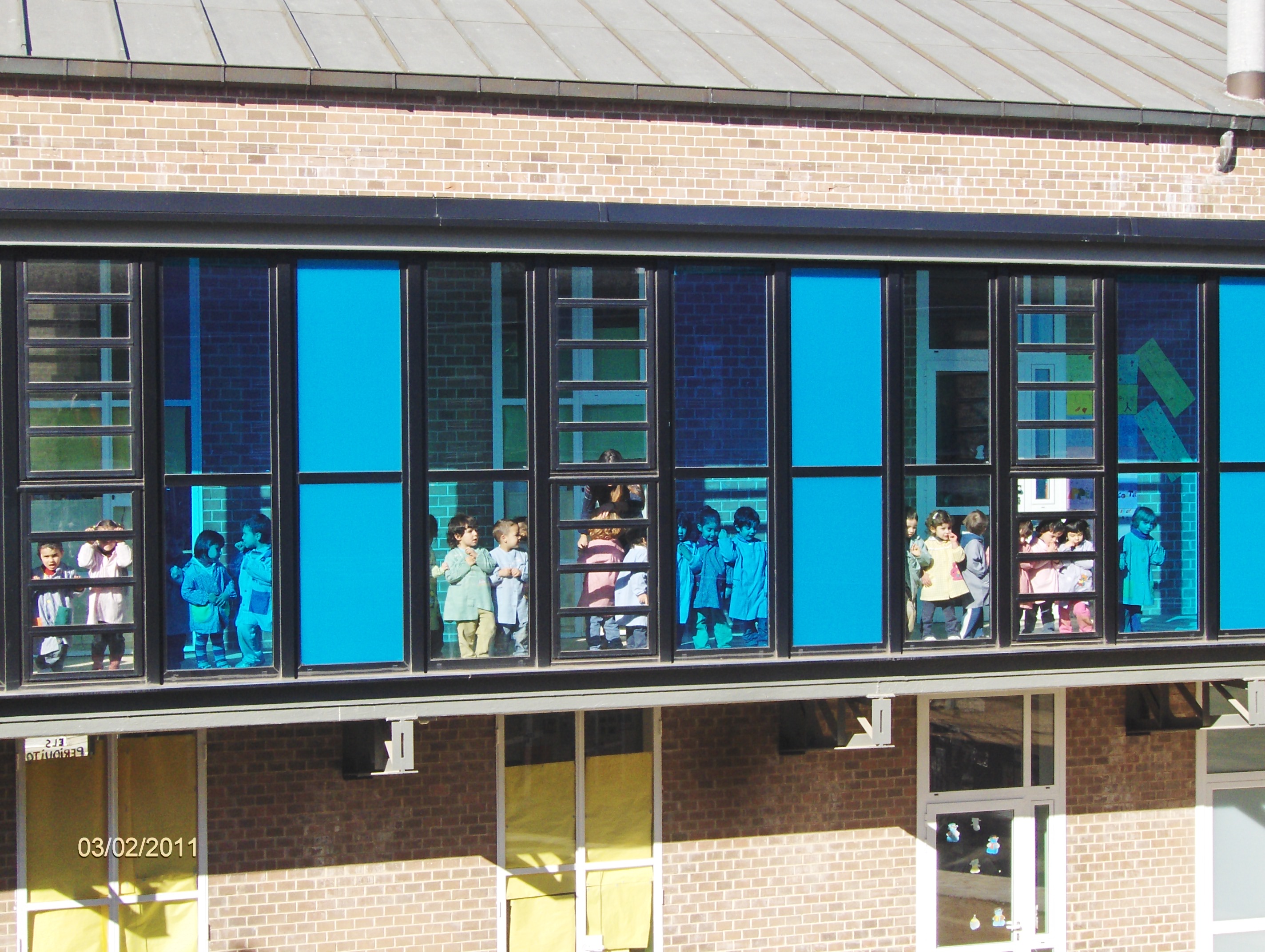 Les girafes de p-3 estem aprenent els colors. Ara ens toca el blau, i em vist el pati de color blau gràcies als vidres que tenim al passadís, a més hem fet un tou de jocs i feines amb el color blau!!