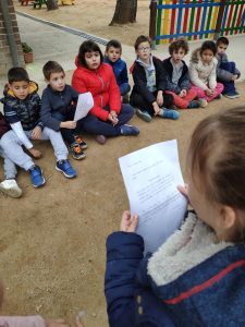 Vam preguntar als nostres avis i àvies com sabien l’hora quan eren petits i ens van contestar que tenien rellotges analògics. També ens van explicar que tenien rellotges de sol. No sabíem què eren, així que vam mirar un video i vam sortir a representar-los al pati amb el nostre propi cos. Vam sortir a les 10:30h i a la tarda vam tornar-hi per comprovar-ho i vam veure que el sol s’havia mogut i que la nostra ombra quedava al darrera.