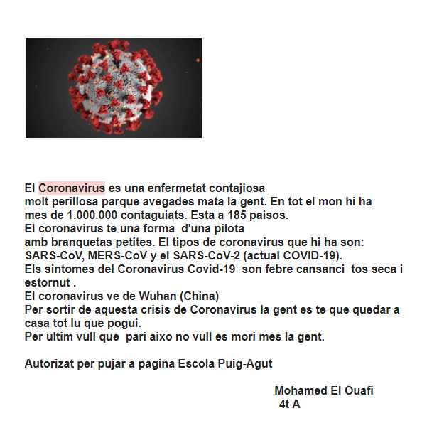 Hola nens i nenes jo sóc la Aya de 4t A, us trobo a faltar molt espero que tot us vagi molt bé jo he fet aquest carta per qué la llegiu, encara que perdem un any igualment ens tornarem a veure per setembre, jo cada dia per no aburrirme sempre faig una mica de deures i al final del dia faig un mini diari, jugu amb les meves germanes, cuino amb la mare, faig esport a casa amb el pare, fem pastissos tots junts i a la nit fem crispetes i mirem una pel·lícula, espero que us ho passeu molt bé que estiguem a casa no vol dir que ens deprimim i ens aburrim, podem fer moltas coses dibertides i guais així que si us avorriu feu una d’aquestes coses i el temps passara volant adéu i espero veure us d’aquí poc temps.