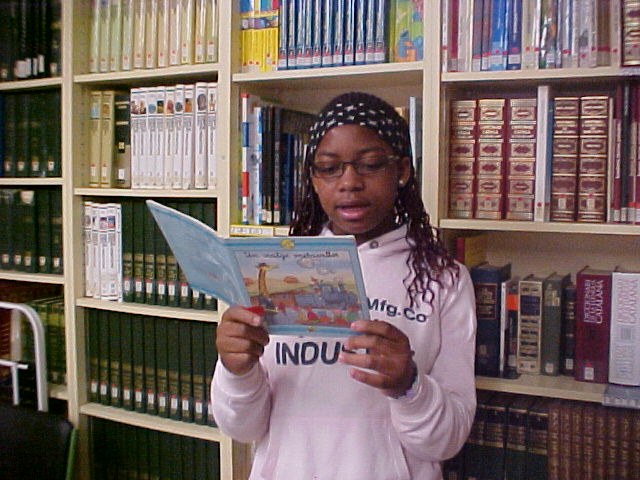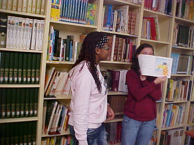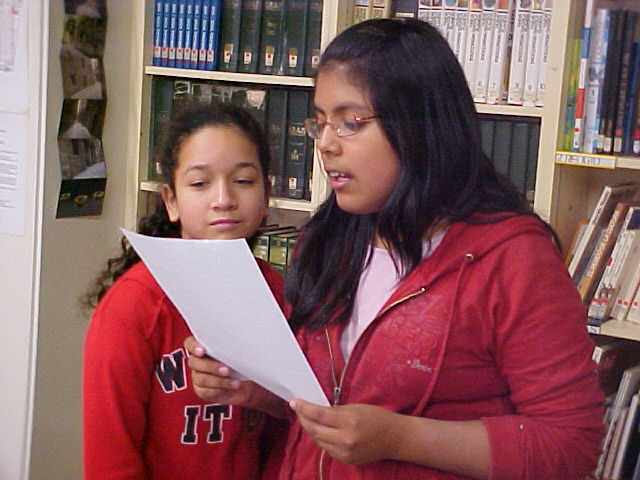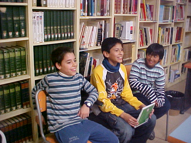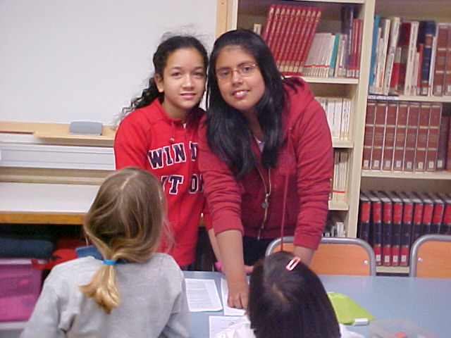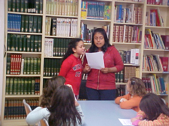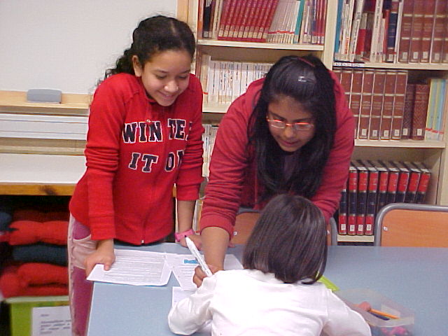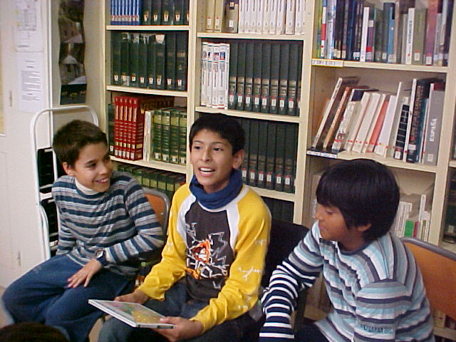 Noel i Juan David de sisè A expliquen el conte: “El petit indi Hiawaiatha” als nens i nenes de primer A.