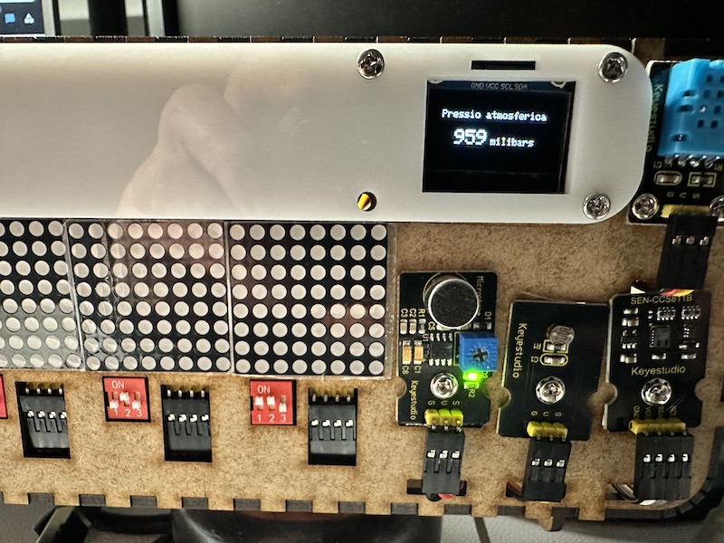 Aquest cop hem aprés a programar els diferents components de l’estació de qualitat de l’aire. Ara ja podem mesurar, el CO2, la lluminositat, la temperatura, la humitat, la pressió atmosfèrica, fer sortir informació pels panells matrius de leds i el panell OLED. També hem pogut guardar les dades en una tarja SD.