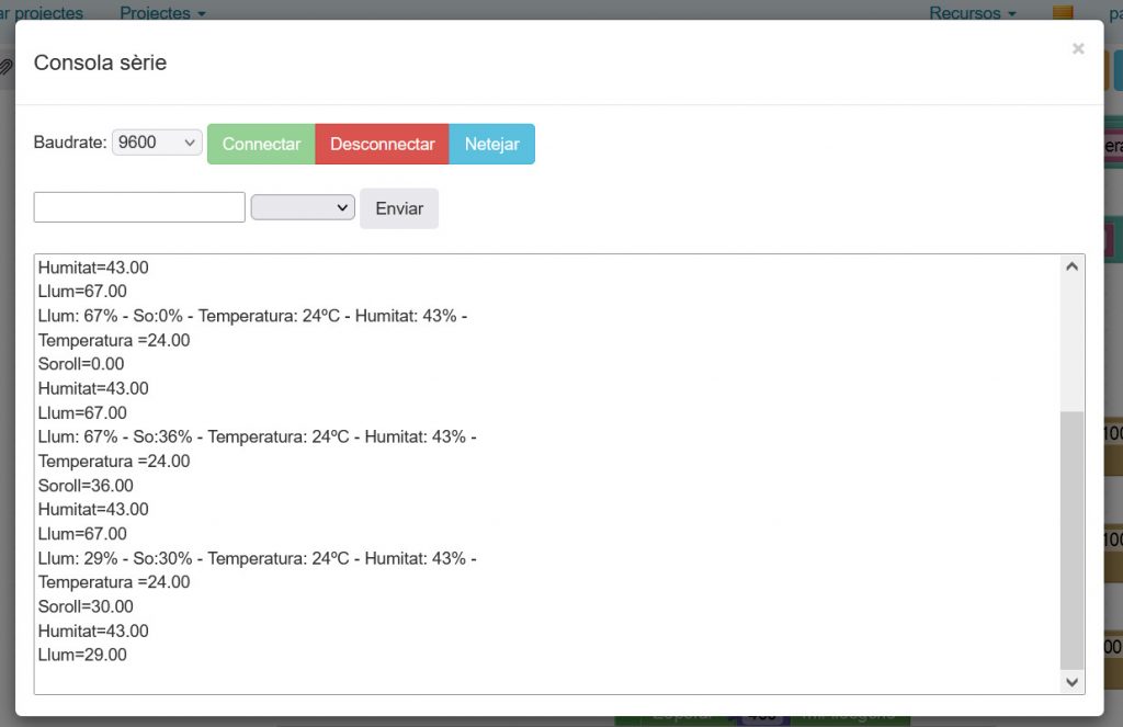 Tot seguit es pot veure la consola de text amb les dades dels sensors: