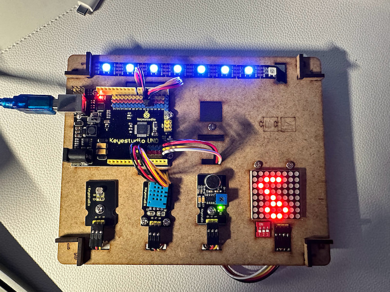 En el neopixel els leds s’encenen i apaguen seqüencialment. En el panell led 8×8 surten consecutivament les 4 primeres lletres de l’alfabet grec.