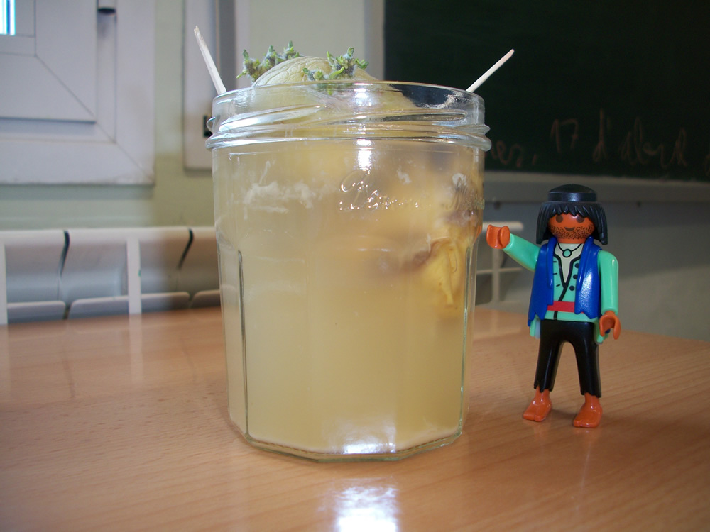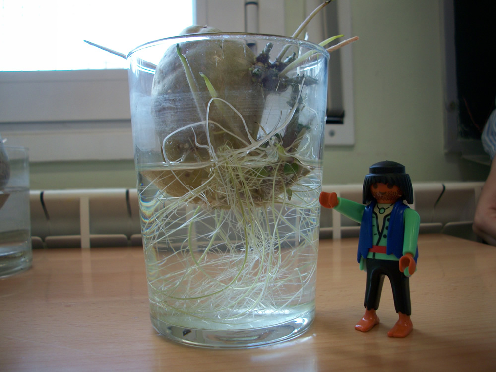 A classe vam fer un experiment amb patates, un got amb aigua i uns palets de fusta. Vam ficar els palets clavats a les patates. Vam ficar les patates amb els palets a sobre del got amb l’aigua. A la primera setmana no va passar res. A la tercera setmana, a una patata per a baix li va sortir una cosa punxeguda. A la cinquena setmana amb aquella patata li van sortir arrels, i algunes patates es van ficar verdes. A la última setmana aquella patata tenia flors, algunes patates tenien herba a sobre i poques patates no tenien res.