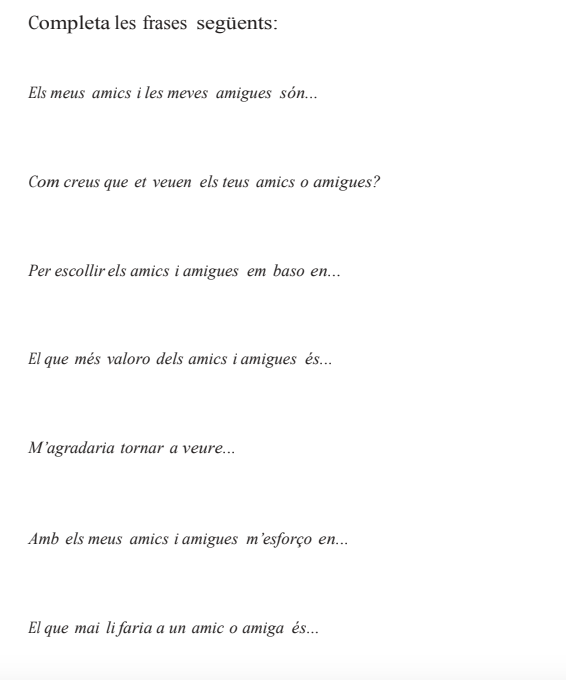 - Quins creus que són els elements essencials d’una bona amistat (sinceritat, comprensió, llibertat, altruisme, respecte, etc.)?