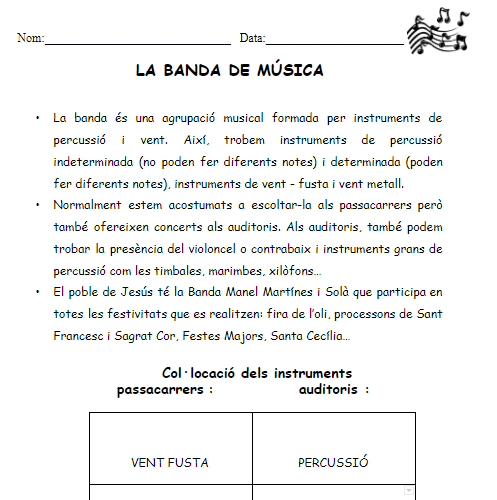 Voleu conèixer la banda de música? Quines famílies d’instruments hi toquen? Com es diu la banda de música del poble? On i quan toca? La voleu escoltar?