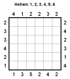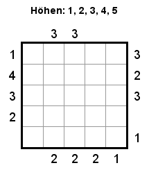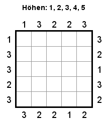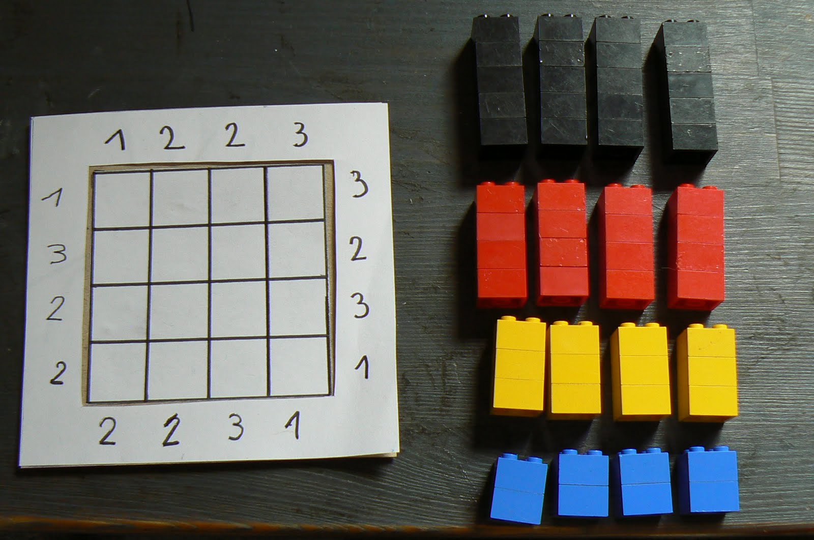 O sea que el número 2 quiere decir que desde este punto se ven dos rascacielos. En la foto por ejemplo se ven en la primera columna el rojo y el negro y en la segunda columna se ven el azul y el negro. En la tercera columna pone un 3 porque se ven el amarillo, el rojo y el negro y en la última un 1 porque solo se ve el negro.