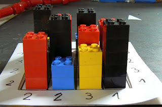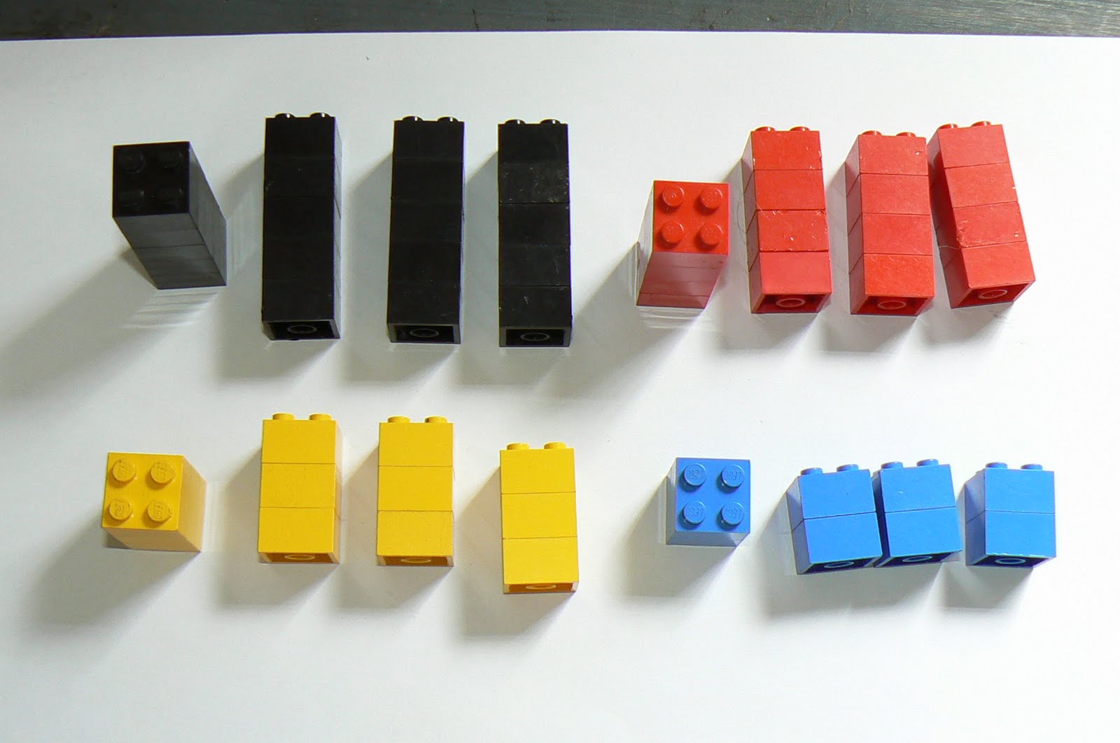 Vamos a construir 4 torres de 2 bloques azules, 4 torres de3 bloques amarillos, 4 torres de 4 bloques rojos y 4 torres de 5 bloques negros.