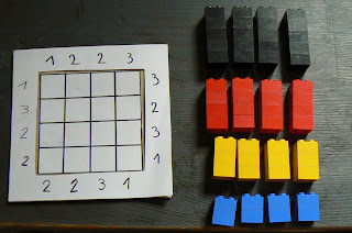 Has de construir una cuadrícula para poner los bloques y por fuera los diferentes números como en la foto de las actividades, después colocar los bloques.Según los números así deberé ver las alturas.