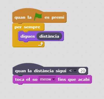 Fer que el gat digui a quina distància del sensor de distància tenim la mà i que quan la mà s’acosti a una distància de menys de 2 (cm. aproximadament) faci el so meow.