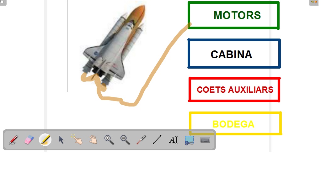 En gran grup, dins l’aula ordinària i utilitzant el programari open board de la pissarra digital, buscarem imatges de coets, en triarem una i relacionarem les seves parts amb el seu nom. Posteriorment, poden escriure les paraules apreses a la pissarra digital.