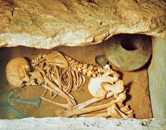 Els arqueòlegs han descobert que els primers éssers humans enterraven els morts en posició fetal (la posició del fetus dins la panxa de la mare). D’aquí han deduit que creien en l’altra vida, ja que entenien la mort com un nou neixement.