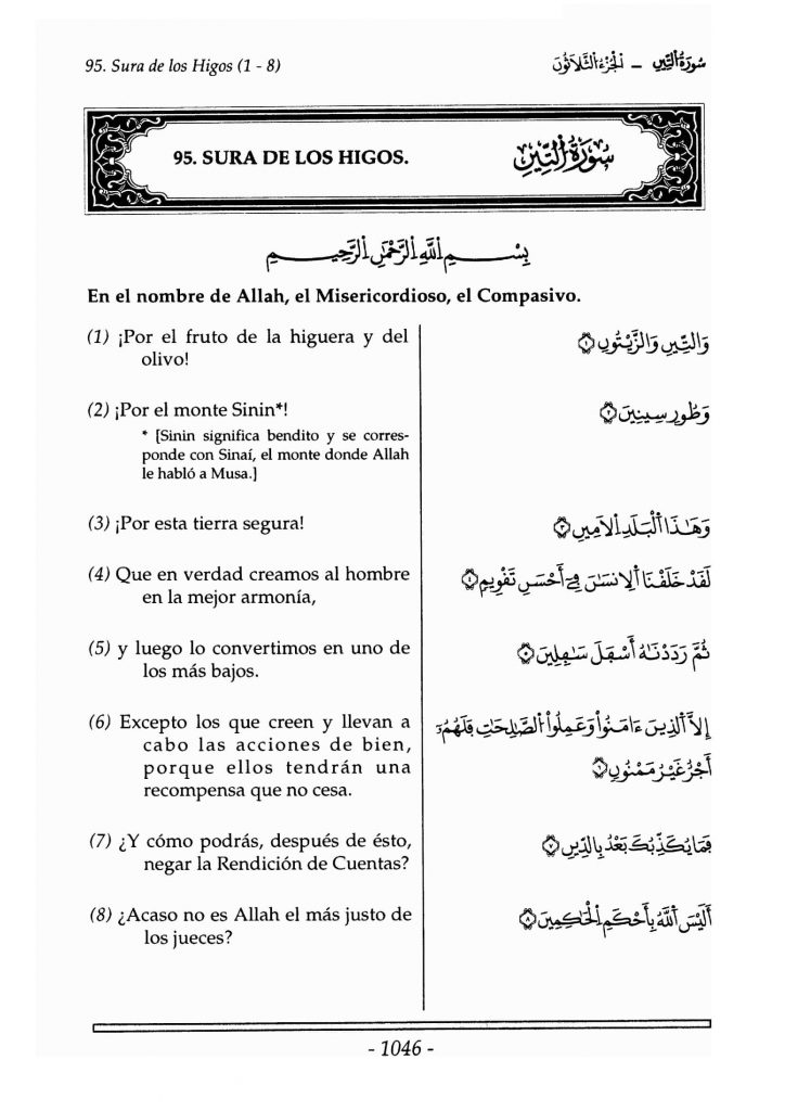 Per la figuera i l’olivera! Pel mont Sinaí! ¡Per aquesta terra segura! Hem creat al l’ésser humà donant-li la millor disposició (complexió). Després, hem fet d’ell el més abjecte, excepte els qui creuen i actuen bé, que rebran una recompensa ininterrompuda. Com pot, doncs, desmentir-se el Judici (la llei moral)? No és Déu, doncs, el millor dels jutges?