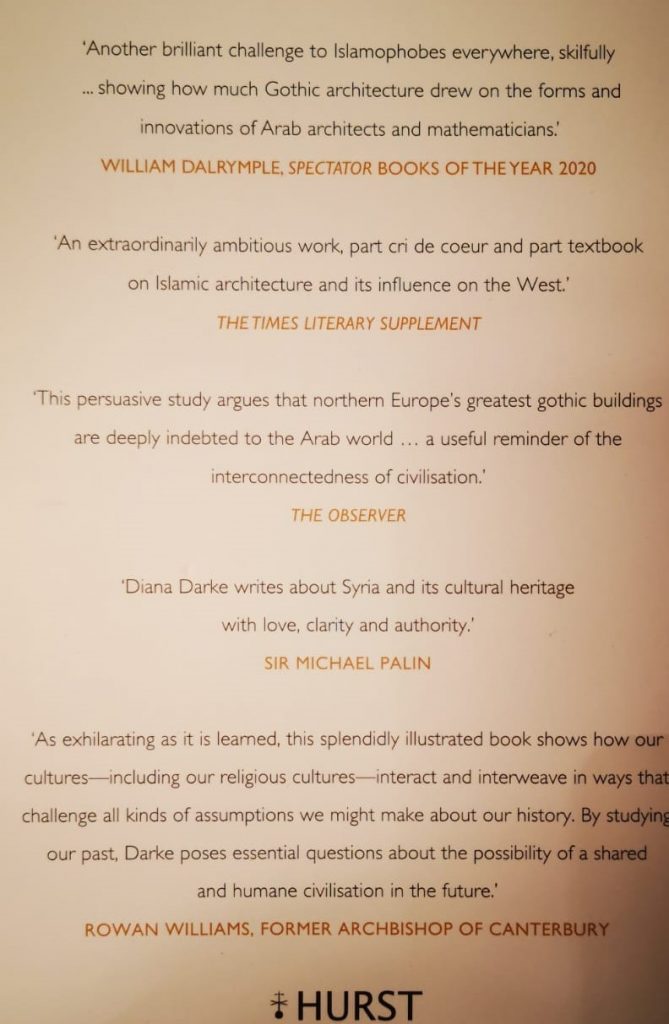 El llibre de Diana Darke “STEALING FROM THE SARACENS, how Islamic Architecture Shaped Europe” demostra la clara influència de l’arquitectura islàmica en la europea. Concretament demostra com els principis arquitectònics dels musulmans àrabs passaren a Europa i serviren de model per a la construcció de totes les cúpules, sobretot del Gòtic però també del Barroc europeu.