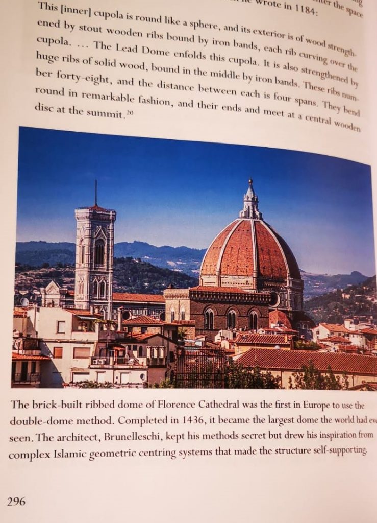 Entre varis exemples, l’autora explica que l’arquitecte de la catedral de Florència es va basar en el sistema de doble cúpula que tenien els complexes disenys islàmics, però va mantenir el seu mètode en secret.