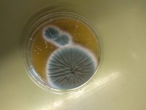 o A la placa de Petri podem veure molts puntets. Cada puntet és una colònia de bacteris que consta de milers d’aquests. També s’han format floridures (fongs) causades per la contaminació de la placa de cultiu, en el moment que vam sembrar els bacteris, amb espores.