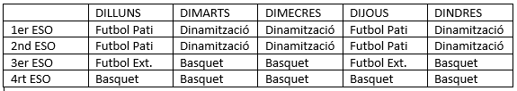 És un projecte sorgit d’una optativa d’educació física de 4t que té per objectiu que l’alumnat d’ESO de primer cicle pugi aprofitar l’hora del pati gaudint de l’esport i els seus beneficis.