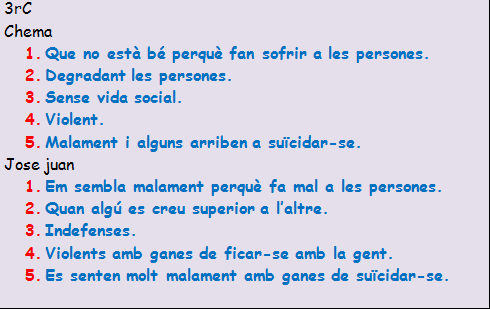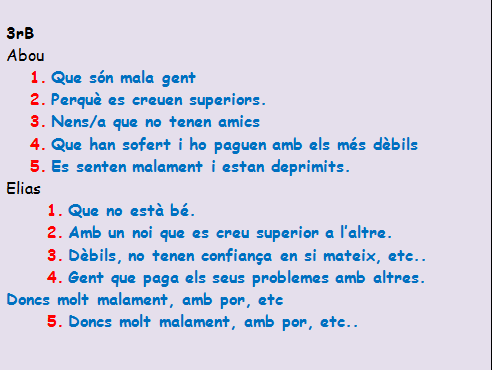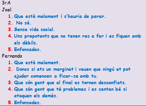 Li hem fet una entrevista a l’Annabel Lozano, professora de mediació. Ens ha dit que a vegades es donen casos d’assetjament. Diu que fan molt mal les xarxes socials i que quan es fa bullying sempre és el líder d’un grup que es dedica a fer mal a persones indefenses. Hi ha hagut casos on la persona a qui han assetjat s’ha sentit amb ganes d’abandonar-ho tot. Qualsevol persona a qui li faltin habilitats socials pot ser assetjada. Les persones que fan bullying són poc respectables i es creuen que tenen el poder fent això. Normalment, darrera d’aquesta persona, hi ha un noi o noia molt insegur en si mateixa. L’Annabel opina que amb la participació de tothom aquests casos es podrien evitar.
