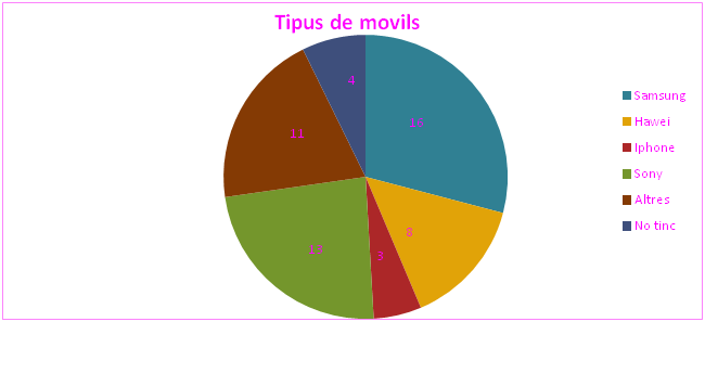 Els nens de primer d’ESO acaben d’arribar a l’institut. El primer que trobaríem si obríssim una motxilla seria un telèfon mòbil. Els nens d’avui dia no poden viure sense el que ja s’ha convertit en una eina imprescindible per als adolescents. Per això hem fet una enquesta i ens hem adonat  que la majoria de gent utilitza un mòbil. L’enquesta la vam realitzar amb ajuda del professor de matemàtiques. Nosaltres vam haver de preguntar a tots els alumnes de primer si tenien mòbil i en cas afirmatiu quina marca  tenien.   Sin título         La nostra conclusió és que la majoria d’ alumnes de primer d’ ESO del nostre institut tenen telèfon mòbil.  En total el 96%. Només 4 alumnes no en tenen. Respecte a la marca del telèfon quasi tothom utilitza Samsung. Un total de 60%. La segona marca més utilitzada és Hawuei amb un 20%.