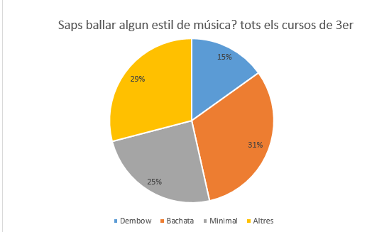 res els alumnes de 3rC hem fet una enquesta sobre estils de ball. L’enquesta l’hem repartit per tot 3r d’ESO i aquest ha sigut el resultat de les preguntes:
