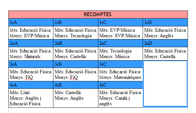 Si ho mirem més detalladament podem veure que entre les que menys agraden a primer hi ha tecnologia, anglès, EVP i música. A segon no agrada ni castellà ni naturals. A tercer FiQ i matemàtiques són les que menys agraden i a quart anglès.