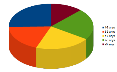 - 4t. 12 persones el practiquen entre 1 i 3 anys, 2 persones entre 3 i 5 anys, 3 persones entre 5 i 7 anys, 2 persones entre 7 i 9 anys, 6 persones més de 9 anys.