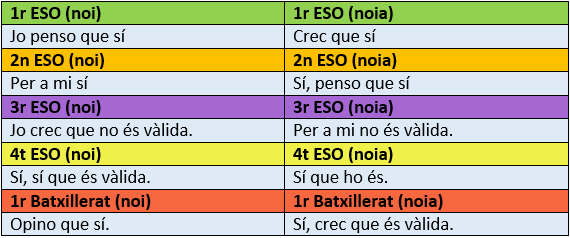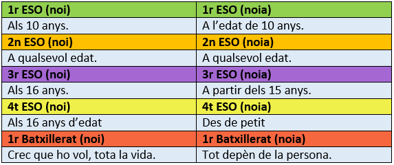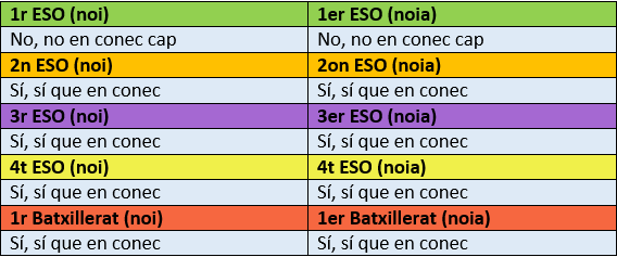 Tenim aquestes graelles amb les respostes de cada curs a les preguntes següents: