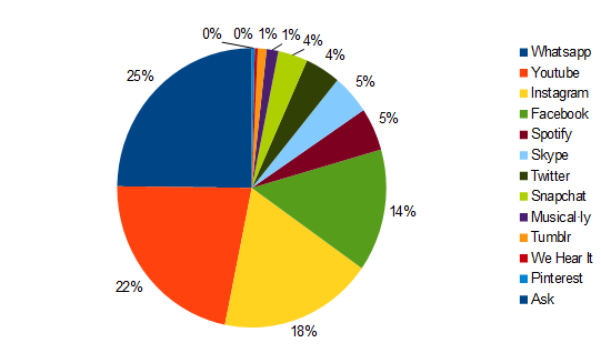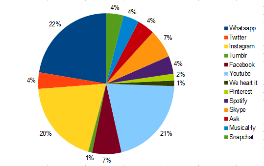 En el nostre estudi sobre les xarxes socials, vam fer una enquesta on posàvem 13 xarxes socials (WhatsApp, Twitter, Instagram. Tumblr, Facebook, Youtube, We Heart It, Pinterest, Spotify, Skype, Ask, Musical·ly i Snapchat) i la gent havia de marcar les seves 4 preferides amb una creueta. La vam passar per 3r i 4t d’ESO.  Segons els resultats que obtenim podem dir que: