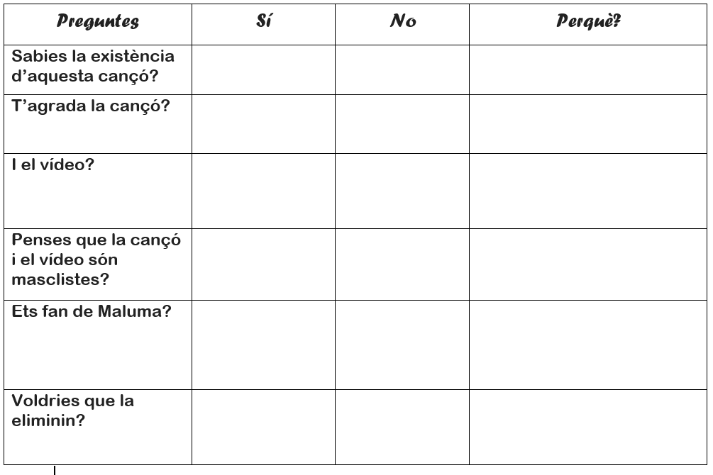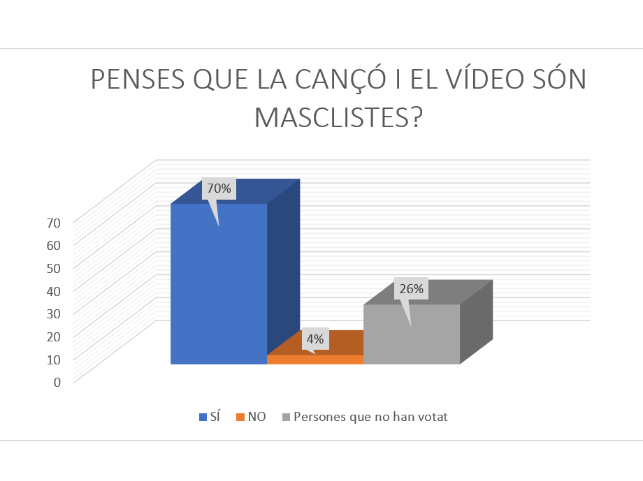 Gràcies als resultats obtinguts podem dir que la majoria dels alumnes pensen que el vídeo i la lletra sí que són masclistes. Els fans de Maluma també han reconegut que el vídeo de la cançó és masclista i que l’haurien d’eliminar.