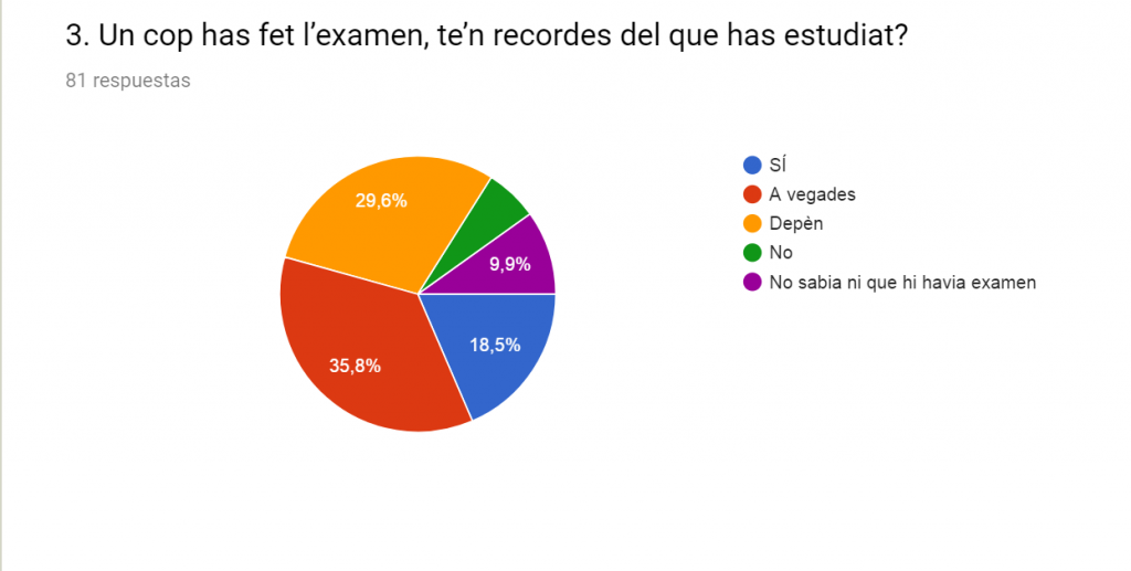 Vam descobrir que la majoria d’alumnes estudien només per aprovar i que a més, després no se’n recorden del que han estudiat. Alguns altres directament no estudien o si ho fan depèn de la matèria. Hi ha moltes opinions, però tothom coincideix en què no hauria de ser així.