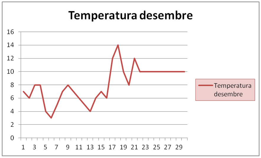 Segons el registre de temperatures que hem fet els alumnes de 2n d’ESO a l’aula de ràdio, la temperatura màxima ha estat de 14ºC, i s’ha produït el dia 16 de desembre, que era divendres. La temperatura mínima ha estat de 3ºC, i s’ha produït el dia 6 de desembre, que era dimarts.