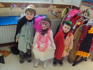 Parlem de què ens podem posar al cap, a la cara, al cos, a les cames, a les mans als peus… i cada nen/a crea la seva pròpia disfressa. Seguidament busquem un lloc a la classe i muntem el raó de les disfresse que decorem amb les fotos que han portat els infants on surten ells en carnavals anteriors.