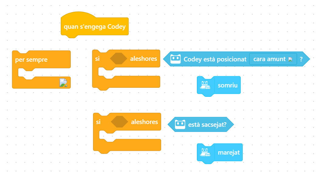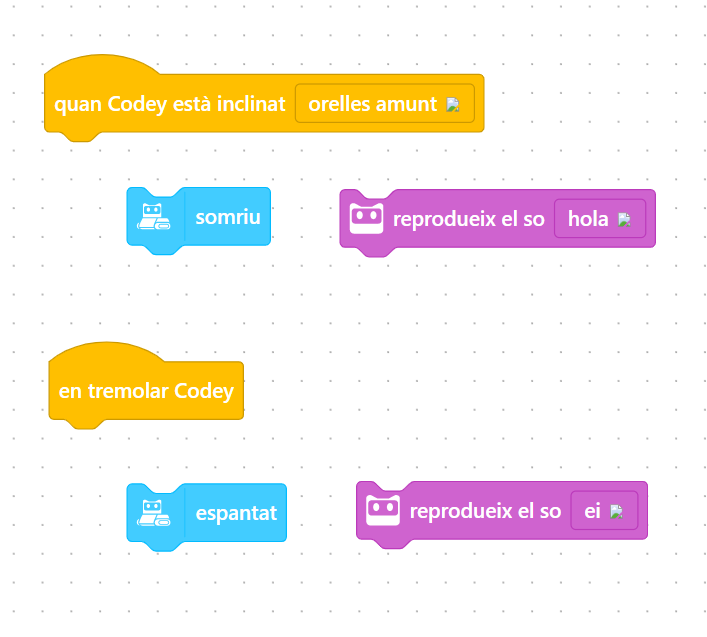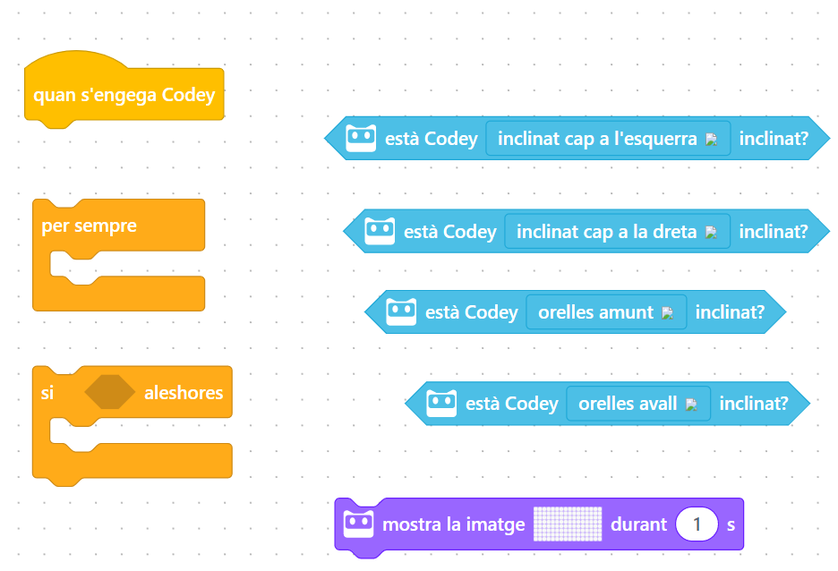 Separa el robot Codey Rocky. Fes que si sacseges Codey mostri a la pantalla una cara de mareig i si el col·loques damunt la mà mostri a la pantalla una cara d’estar somrient.