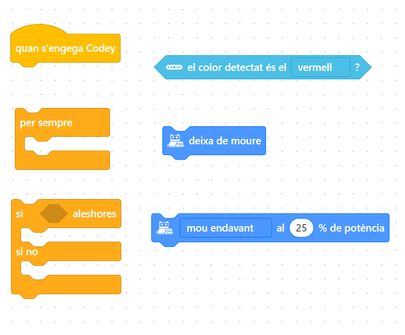 Fes que el robot Codey Rocky faci sevir el sensor d’infrarojos. Si es troba una targeta de color vermell el robot Codey Rocky s’ha d’aturar. Si no es troba cap targeta de color vermell el robot Codey Rocky ha d’avançar endavant.