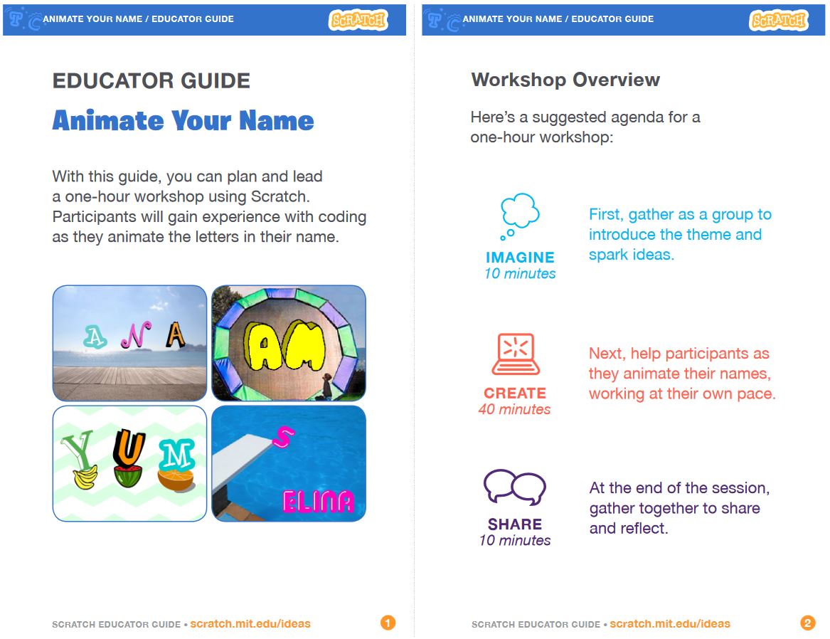 A les guies de docent corresponents (de moment en anglès), l’equip de Scratch fa una proposta de distribució horària del taller d’una hora que té tres parts: 10 minuts inicials per imaginar, 40 minuts per crear i 10 minuts finals per compartir.