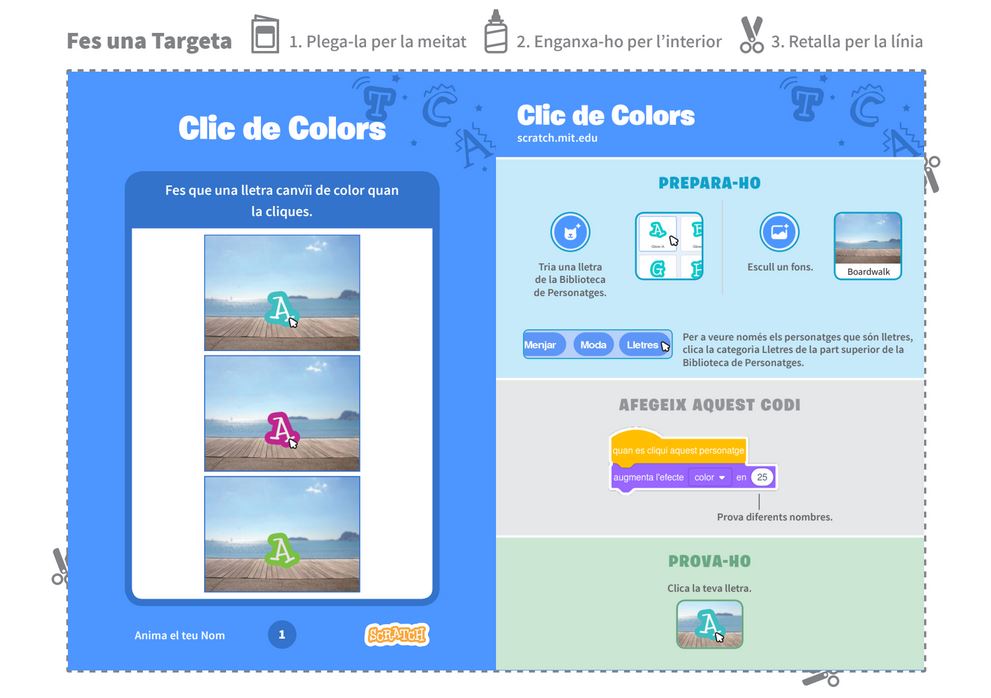 Les targetes Scratch són un material molt útil per aprendre d’una manera guiada a fer servir Scratch. Cada un dels conjunts targetes està pensat per utilitzar-lo en una hora de classe aproximadament.