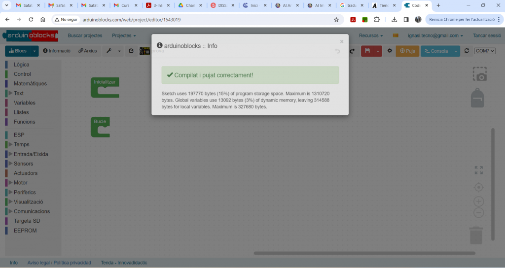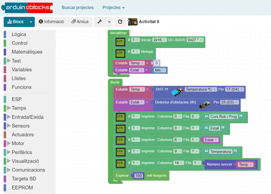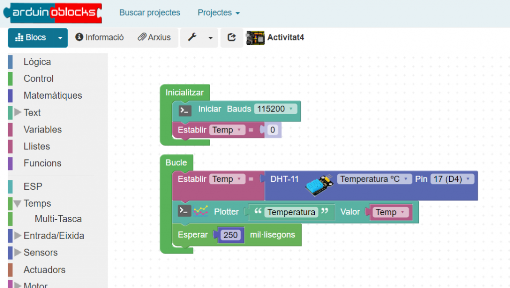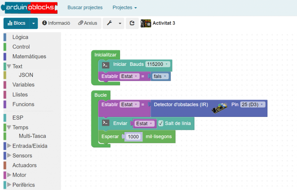 ArduinoBlocks és una interfície de programació visual basada en blocs que simplifica el procés d’aprenentatge de la programació. En lloc d’escriure codi, els estudiants poden arrossegar i deixar anar blocs de codi predefinits per a realitzar diverses accions, com encendre i apagar llums, llegir sensors, controlar motors i més. Aquesta interfície és molt amigable per als principiants i permet als estudiants centrar-se en els conceptes de programació sense la complexitat sintàctica del codi convencional.