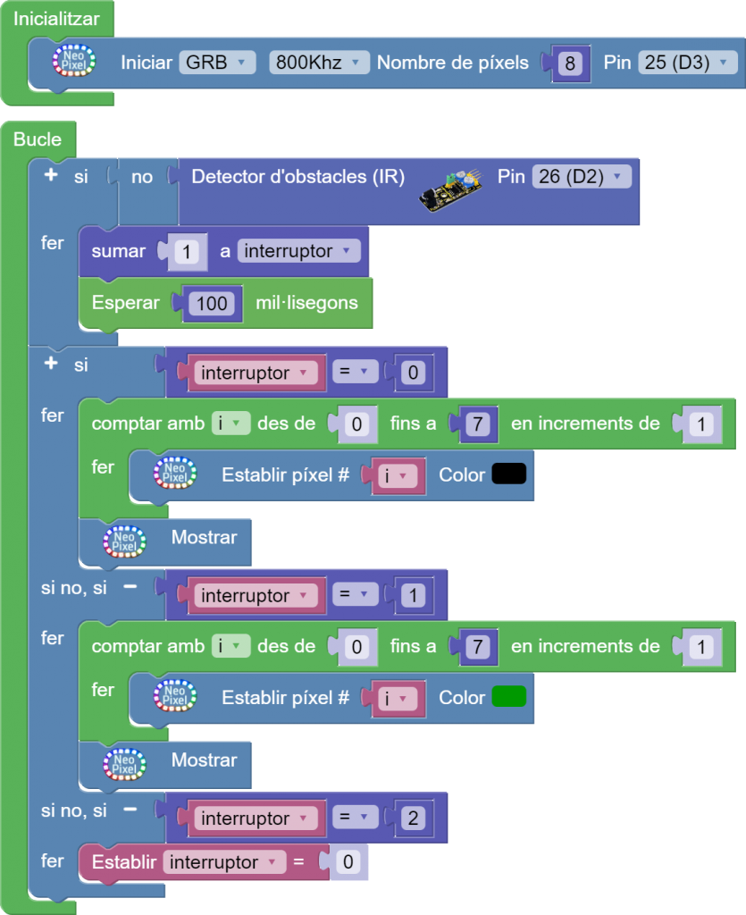 - Encendre leds de la tira Neopíxel amb detecció d’obstacle