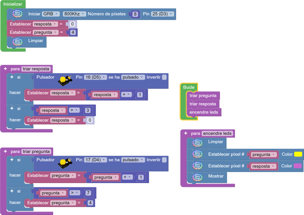 - Fer selecció, amb els dos polsadors, de leds que estaran associats a preguntes i a respostes en un possible joc.