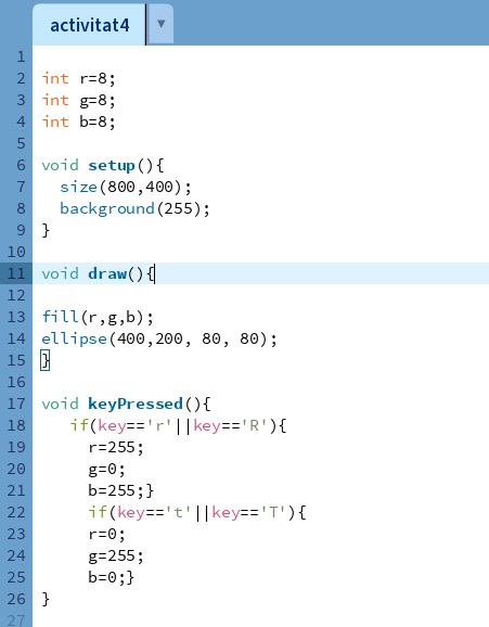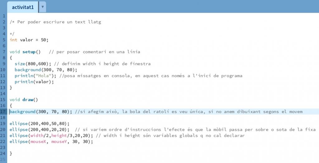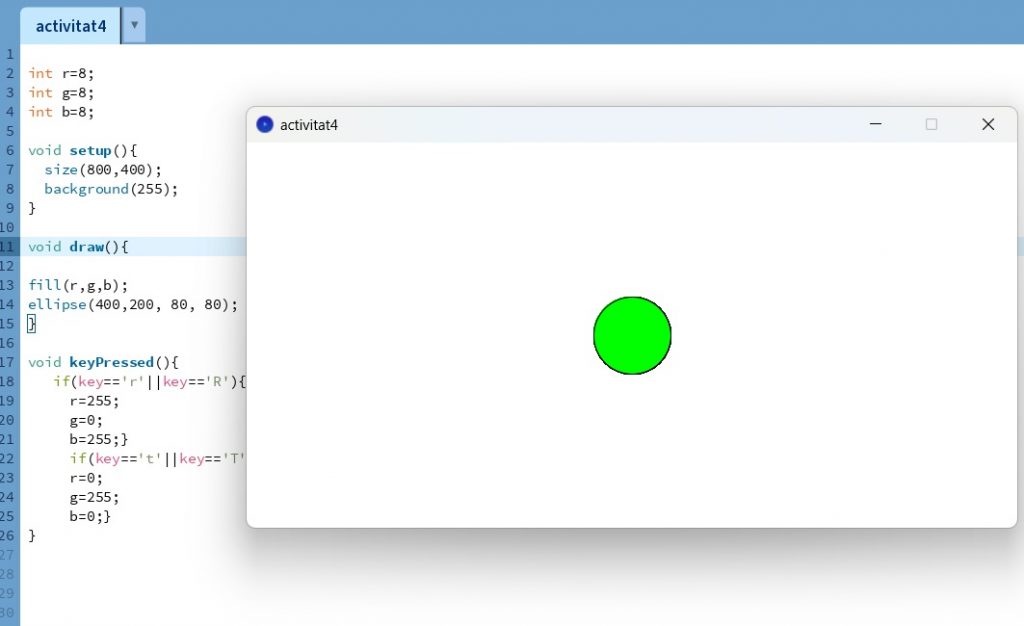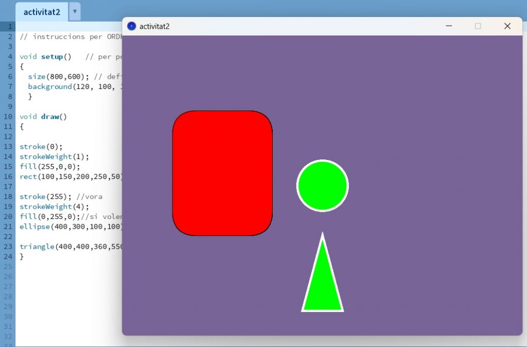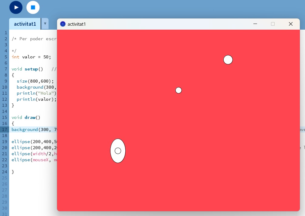 setup(): Aquesta funció s’executa una sola vegada al començament del programa i s’utilitza per inicialitzar paràmetres com la mida de la finestra, el color de fons, etc. - Funció