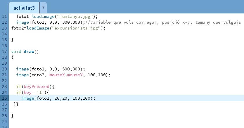 mousePressed(),keyPressed(), etc. - Llibreries: Processing disposa d’una gran varietat de llibreries addicionals que amplien les seves capacitats. Aquestes llibreries proporcionen funcionalitats com la manipulació d’imatges, la generació de soroll, la comunicació amb perifèrics, entre altres.