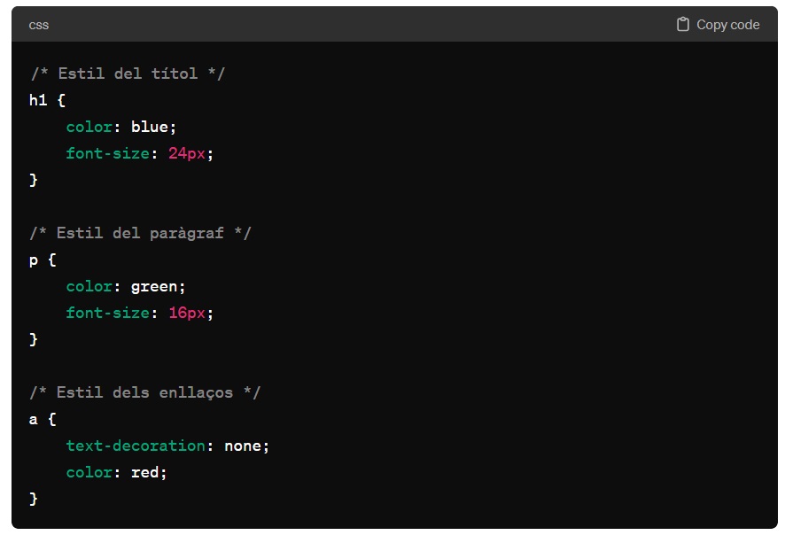 Aquí teniu un exemple senzill de com es pot utilitzar CSS per estilitzar els elements d’un document HTML: