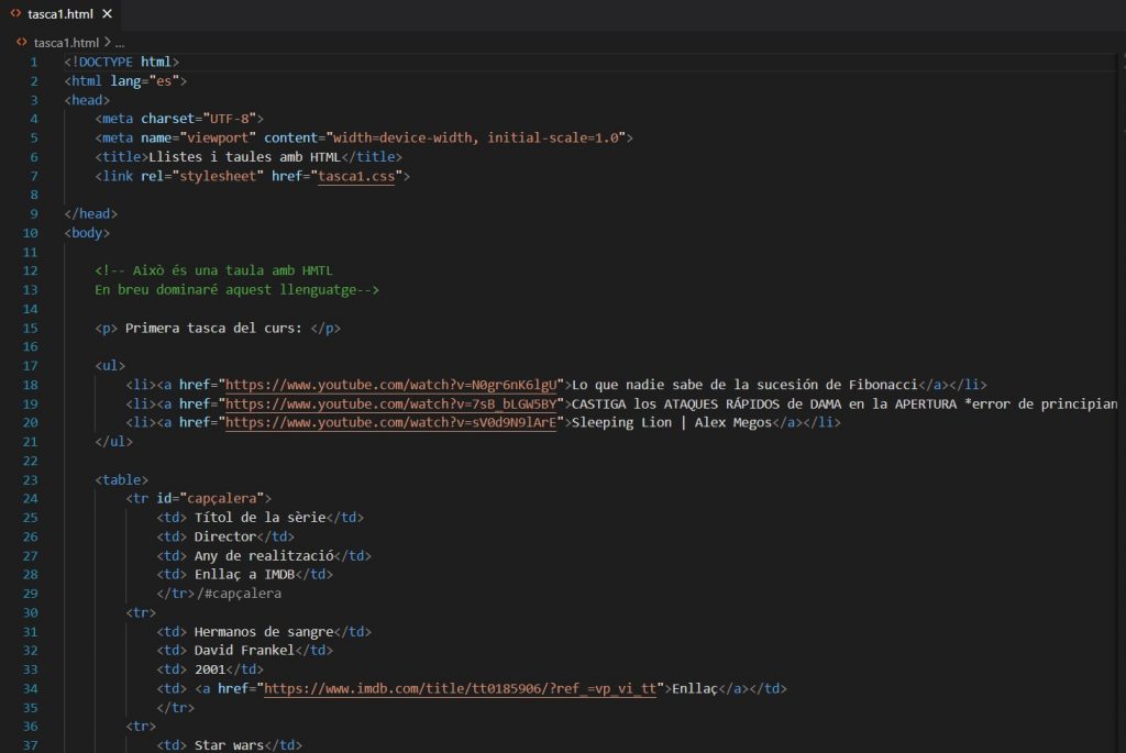 ● dins l’etiqueta body posa un comentari amb mínim dues línees: Això és una taula amb HMTL En breu dominaré aquest llenguatge