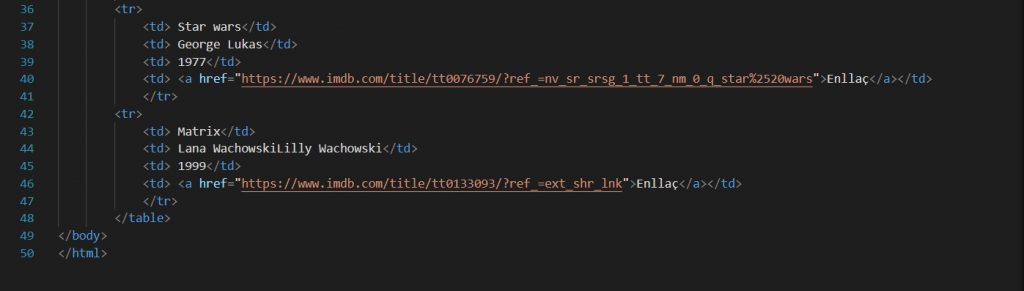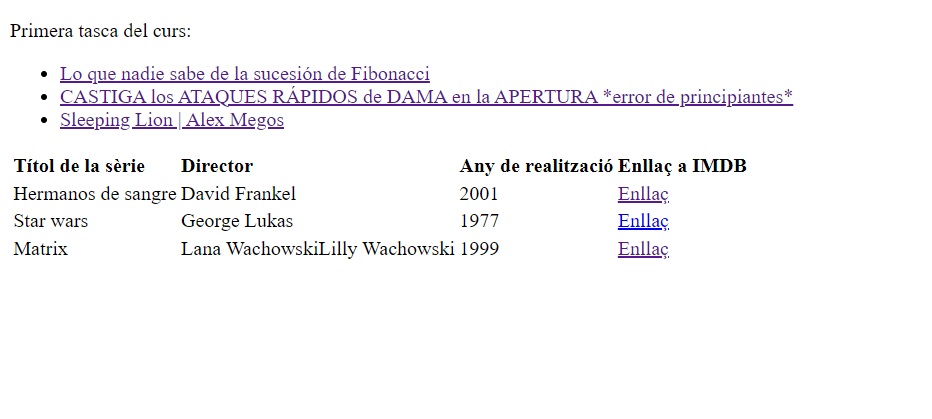 ● Crea una taula amb les següents característiques: ○ les columnes seran les següents: “Titol”, “Director”, “Any de realització” i “Enllça a IMDB” ○ has d’incloure almenys 3 entrades de 3 películes o sèries que t’agradin.
