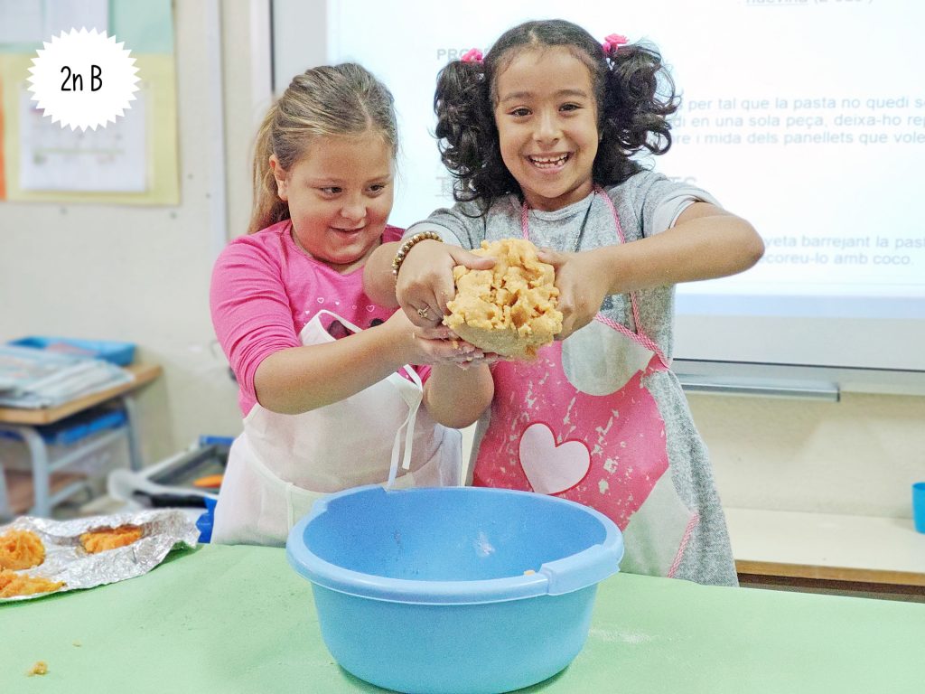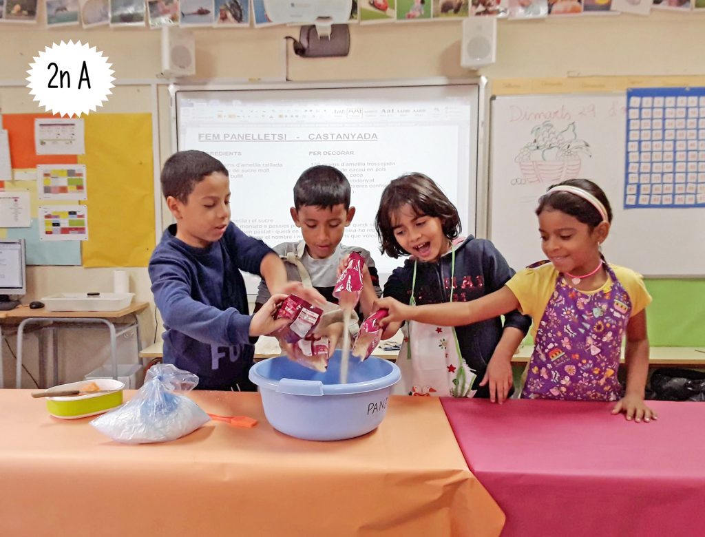 A més a més, cal recordar que dimecres tots els alumnes de 2n van fer els seus panellets amb l’ajuda de la recepta. Les mestres van col·laborar i els hi van fer un cop de mà. Durat l’elaboració nens i nenes feien panellets, altres estaven documentant amb l’ajuda de les tauletes digitals tot el procés dels panellets, així que les fotografies que veureu a continuació estan fetes pels alumnes.