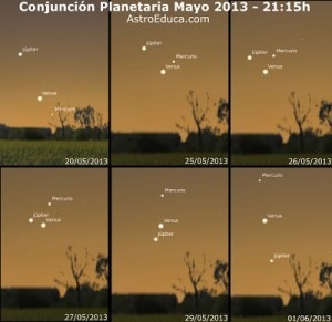 UNA CONJUNCIÓ PLANETÀRIA ÉS QUAN VEIEM ALGUNS PLANETES ALINEATS AL CEL, MOLT A PROP L’UN DE L’ALTRE. SI AQUESTS DIES MIREU EL CEL AMB ATENCIÓ JUST DESPRÉS DE LA POSTA DE SOL, PODREU VEURE UNA CONJUNCIÓ DE JÚPITER, VENUS I MERCURI. I SENSE TELESCOPI!!! APA, JA TENIU FEINA AQUEST CAP DE SETMANA. SI US ANIMEU A FER FOTOS LES PENJAREM AL BLOC.