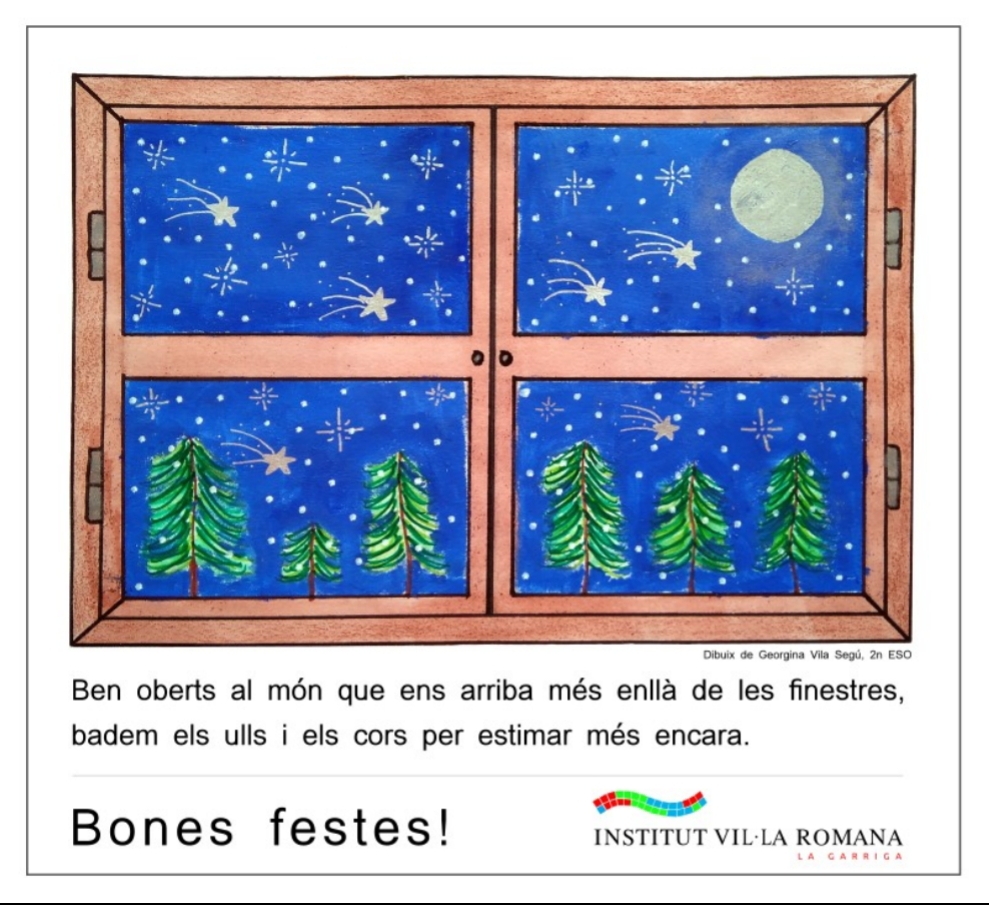 Seguint el nostre fil de les finestres i el dibuix, vaig escriure la frase de la felicitació de l’institut. Estimar també és tenir cura dels altres i d’un mateix, valorar, respectar… Sens dubte, l’amor és la funció més complexa i alta que experimentem els humans. Ens queden molts dies per estimar més encara. 🙂 <3