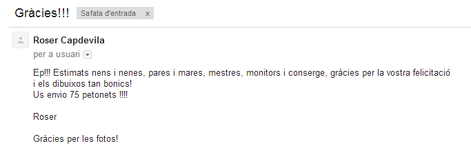 Avui, 28 de gener, hem rebut a l’escola un mail de la Roser Capdevila en resposta a la nostra felicitació del seu 75è aniversari.