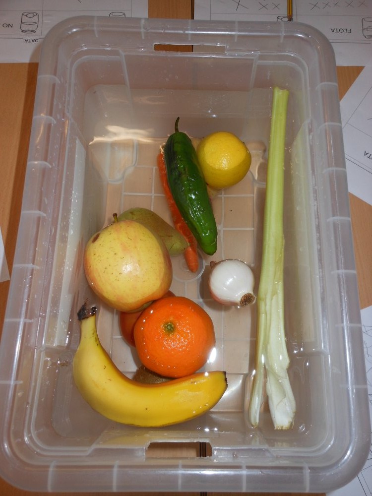 Després, hem experimentat fent hipòtesis i provant quines fruites i verdures suren a l’aigua i quines no.